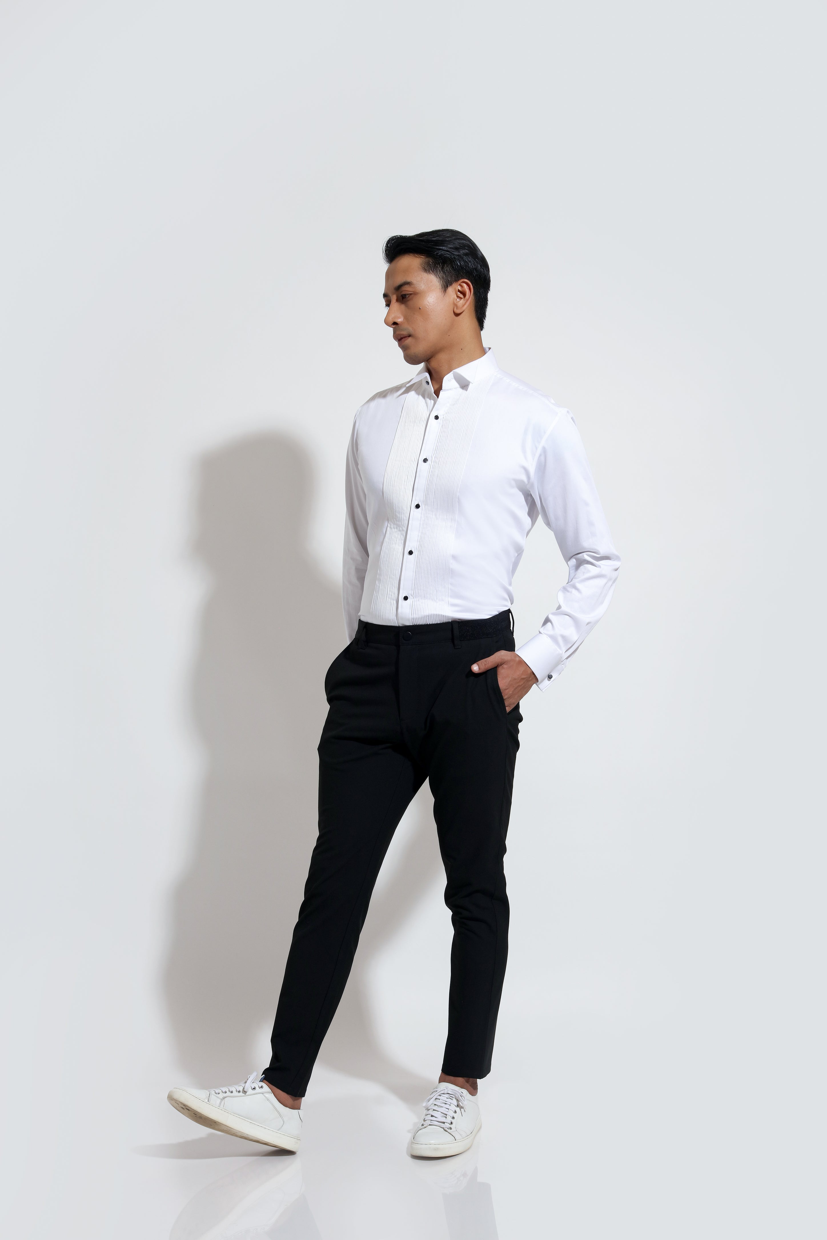 Long sleeve wing collar shirt with cufflink and contrast buttons